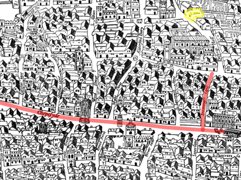 The route from the White Bear Inn (top right) via Cheapside, Paternoster Row and Ludgate on the Agas Map