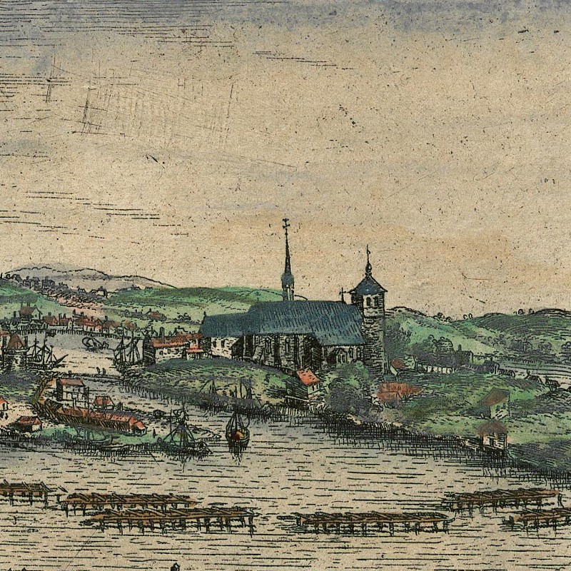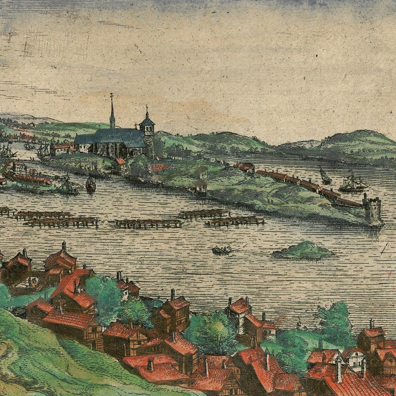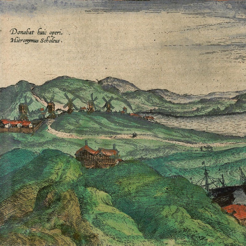 The island was called “Munckholmen”. It translates as ‘Monk Island’, but it is now known as Riddarholmen. The Greyfriars Monastery on the island was dissolved in 1527 during the Protestant Reformation. Its buildings were repurposed as a hospital and, from 1576, as a school of Theology. The island is depicted in both views in the Civitates.