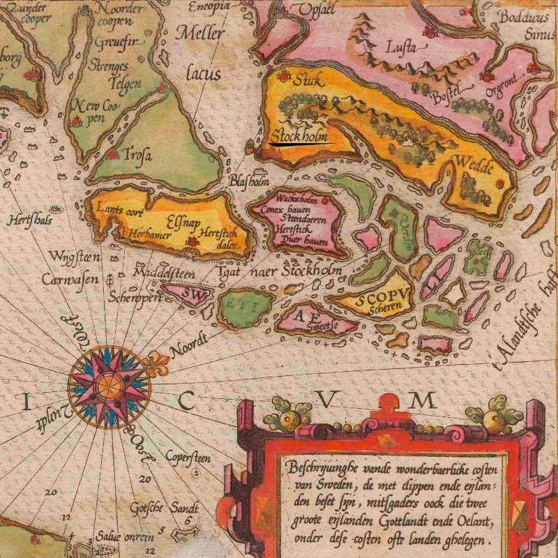 The dangerous approach to Stockholm is neatly depicted in a naval chart from 1585. The chart shows the Swedish coast from the east. At the top is Lake Mälaren (Meller lacus). Stockholm is marked, and at the bottom of the image are the myriad of large and small islands that ships had to navigate to reach the city.4