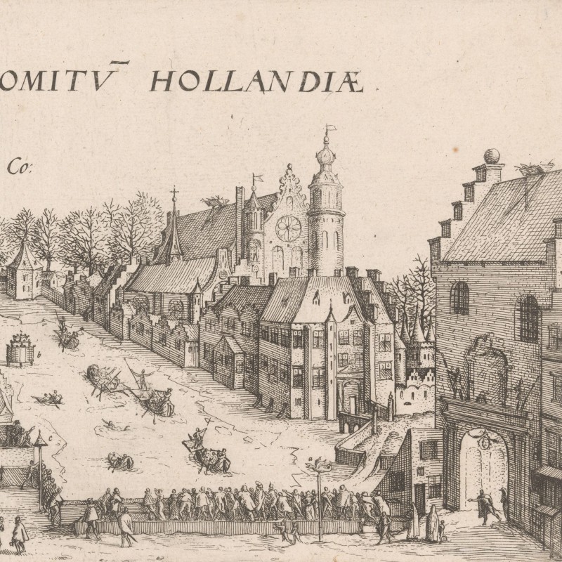 In the centre of the view is the Binnenhof, a palace complex that initially served as the residence of the Counts of Holland. After the Dutch Republic declared their independence in 1581, the Binnenhof became the meeting place of the States General — the legislative assembly comprising representatives from each province.